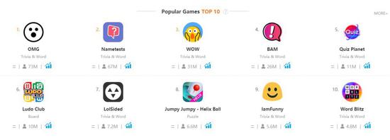 GameSkyfall的数据显示,动作类、以及益智类游戏无论是在移动端还是网页端,都更容易受到Facebook的推荐,动作类在两个平台的推荐率占比都超过17%,益智类则都超过了15%的推荐量占比,说明这是FB希望重点加强的游戏品类。 除此之外,模拟、棋牌、体育、卡牌等品类也是Facebook希望加强引导的品类。相比之下目前称霸平台的竞猜文字类推荐率则与用户规模不相称。 TOP10头部产品基本都是竞猜文字游戏 单款游戏活跃用户量上,GameSkyfall数据显示目前Facebook排名第一的《OMG》达到了7300万,比第二名高了600万,但随后的排名就相差较远,第7名之后的活跃用户数全部低于1000万。 《OMG》活跃用户最高曾达1.438亿
