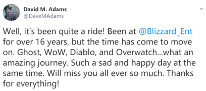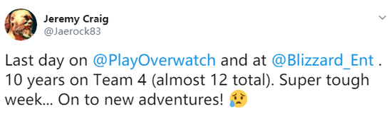 “在暴雪的最后一天了…在第4小组一共待了十年(在公司总共待了快12年)。对我而言这是艰难的一周…开始人生的全新篇章!”