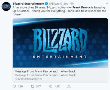 据一名离职的暴雪员工(匿名)在国外4chan论坛爆料,整个暴雪的情绪十分地低落,多个项目被砍,员工压力超大。 近日,暴雪官方Twitter宣布,公司的联合创始人Frank Pearce将正式从暴雪离职,同时暴雪还公开了Frank亲自所写的告别信,并感谢了Frank在暴雪28年来所做出的贡献。